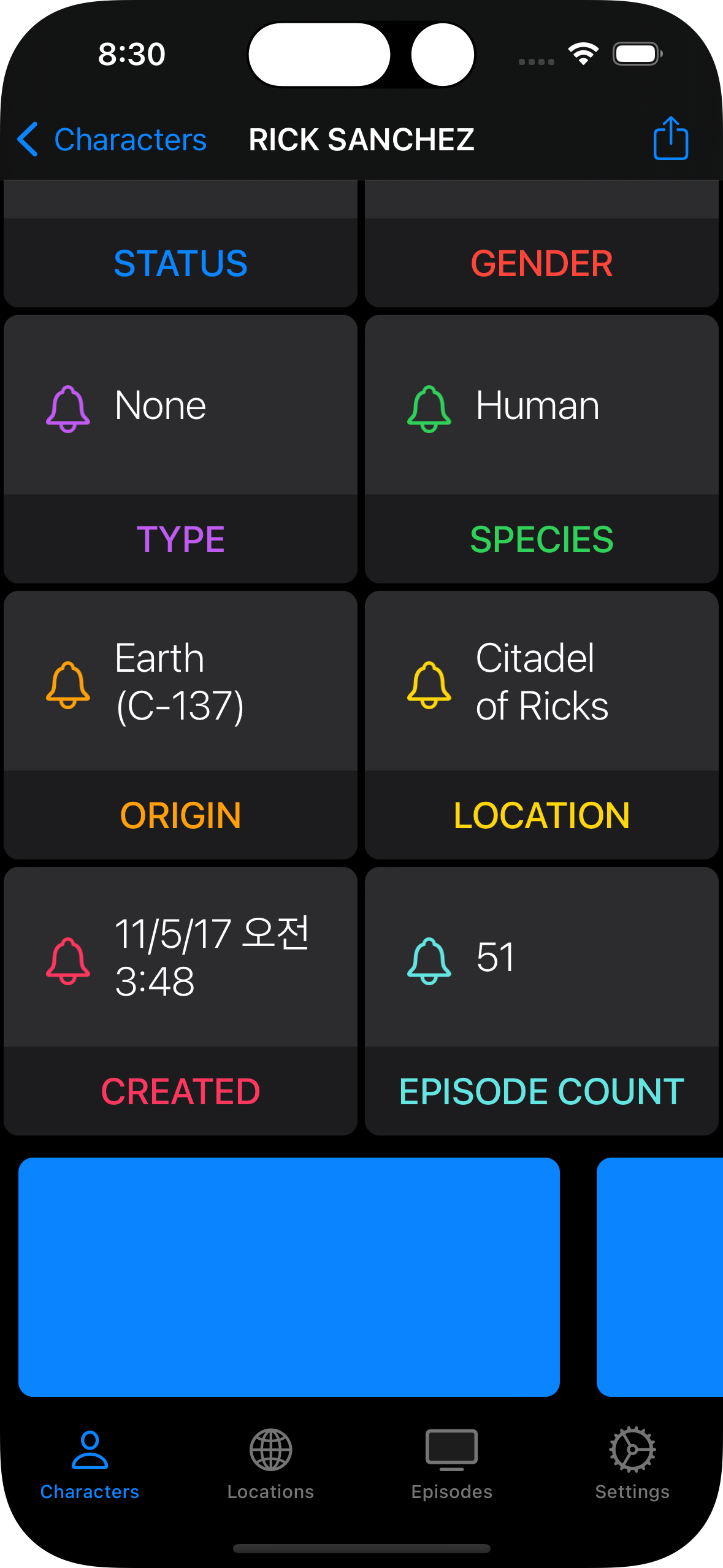 세 번째 섹션에 대해 기억이 안 난다면 다음과 같이 파란색으로 칠해서 보자. 파란색 카드들이 줄지어 있을 것이다. 에피소드 카운트만큼 생성됐으므로 릭 산체스의 경우 51개가 존재한다.
